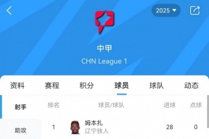 中甲最新射手榜(截至第28轮):